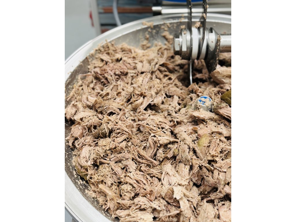 Kachní maso po upečení sesekneme na kutru, abychom zkrátili dlouhá prsní vlákna a následně ručně rozmělníme do požadované konzistence. Smícháme se sádlem a přirozeným výpekem a ručně plníme do sklenic. Takto vyrobenou sklenici zasterilujeme, aby mohla bezpečně přijít na Váš stůl.