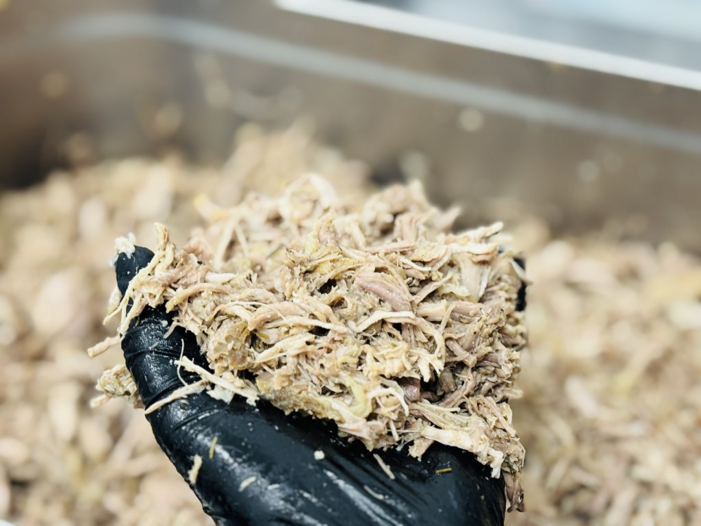 Vepřové maso po upečení ručně rozmělníme do masových vláken, smícháme s přirozeným výpekem a sádlem a ručně plníme do sklenic. Takto vyrobenou sklenici zasterilujeme, aby mohla přijít bezpečně na Váš stůl.